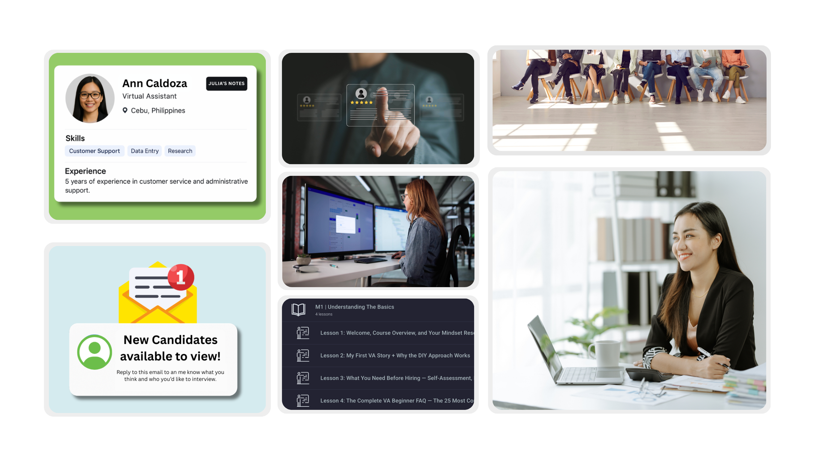 Getting started is simple. First, take the VA Readiness Quiz so you’re clear on whether now is the right time, what type of VA you need, and what to delegate first. Then choose your path: if you want to learn and execute the system yourself, start with the DIY E-Course; if you want the same system executed with you, book a call for Done-For-You Matchmaking. After that, we confirm your role, hours, and outcomes, and you’ll have a clear next step within 24–48 hours (either your course roadmap or your hiring plan and timeline).